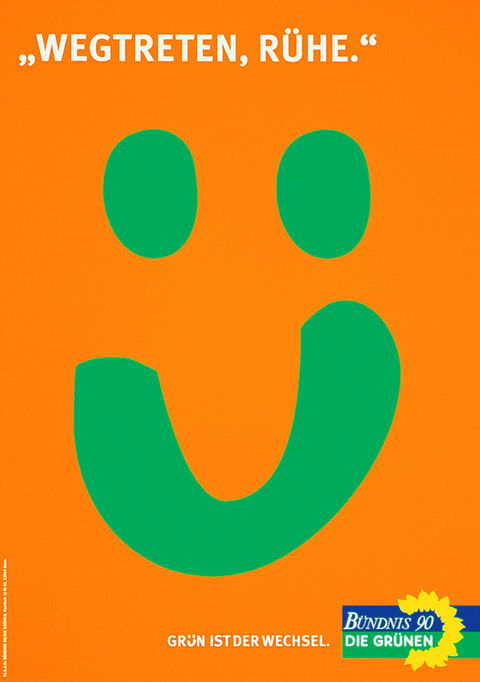 Idee: Die neuen Grünen sollten mit einem neuen, frischen Zeichen antreten. Die Agentur machte ein grünes, lustiges Ü, das alle anlacht, zum neuen Gesicht der Grünen. Das Ü wird auf allen Werbemitteln zum Symbol und Sympathieträger von Bündnis 90/Die Grünen. Das Ü lässt Raum für freche, witzige, ironische Aussagen. Die reduzierte grafische Form des grünen Ü auf farbigem Grund sorgt für hohe Aufmerksamkeit.